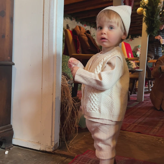 The perfect blend of comfort and style with our unisex chunky knitted cardigan, designed for infants. Crafted from soft cotton, this creme color versatile sweater vest is ideal for layering during the transitional seasons of spring and autumn, as well as providing warmth in winter.