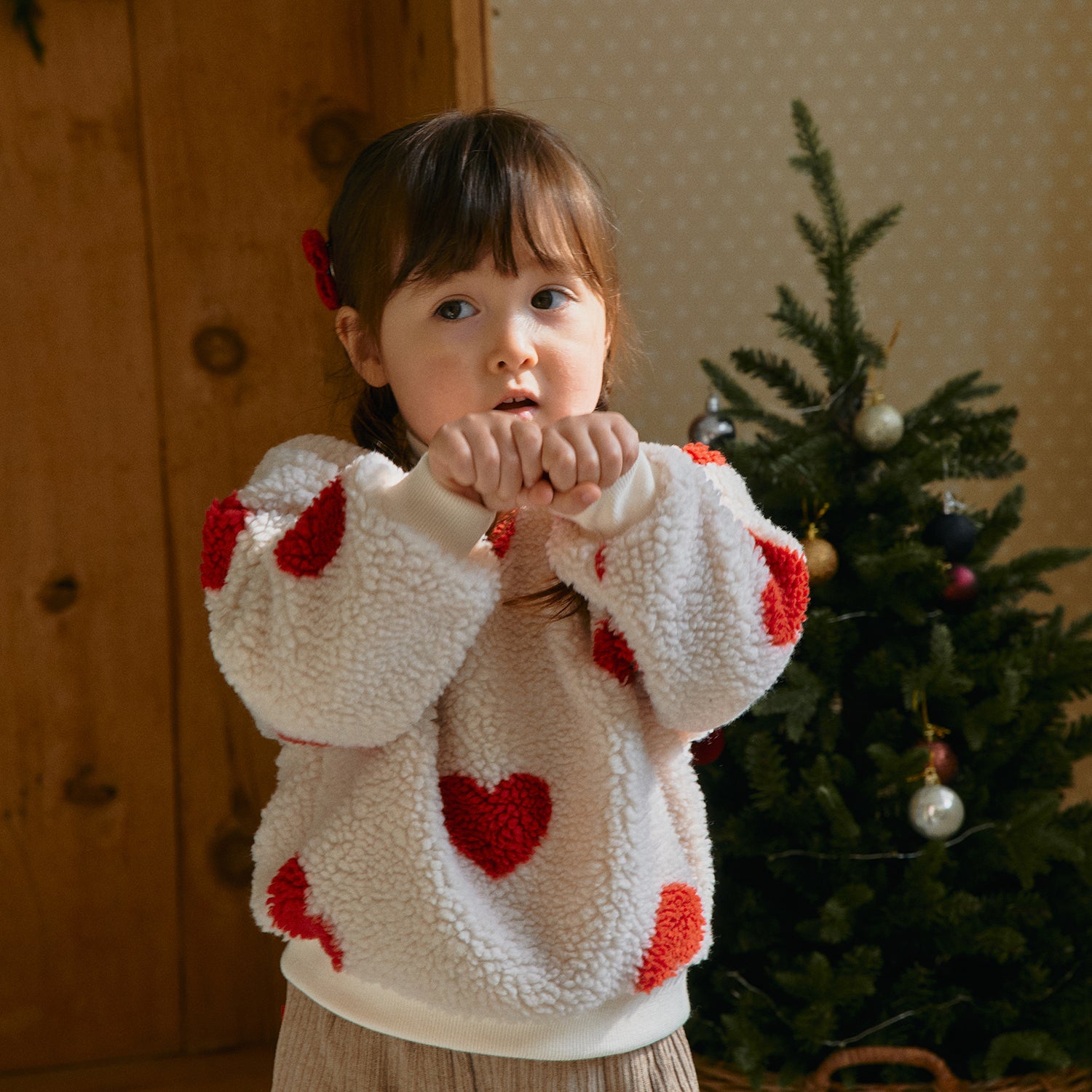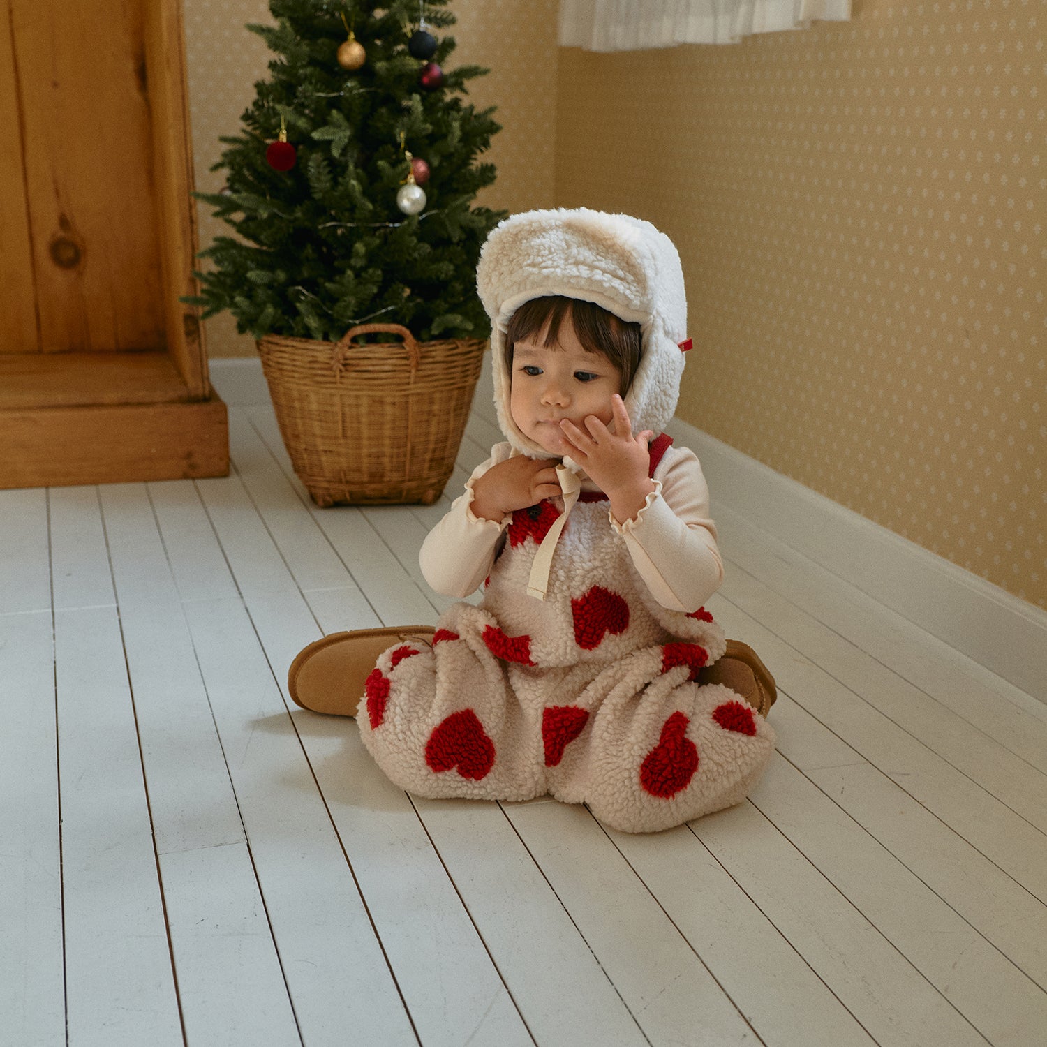 a cozy romper and a plush sweatshirt. Made from soft teddy sherpa fleece with bright red heart details, this winter essential keeps babies and toddlers snug, stylish, and picture-ready all season long.